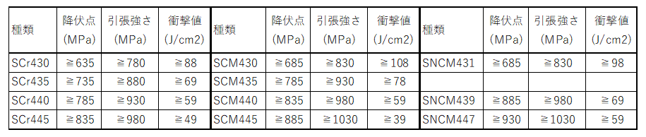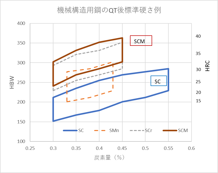焼きならしで使用する場合は、機械構造用炭素鋼(SC)が前提になりますが、焼入れ焼戻して使う場合は細径(例えばφ20以下)を除いて、機械構造用合金鋼が前提になります。