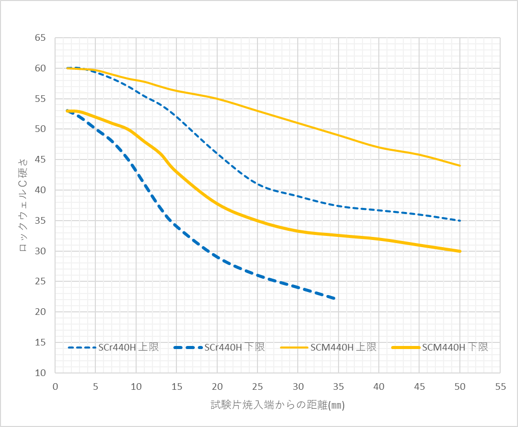 A. SCM440HはJominy試験で焼入性を保証した鋼材です。SCM440は試験は実施していませんが、成分が保証されているので同等の焼入性を有していると考えられます。